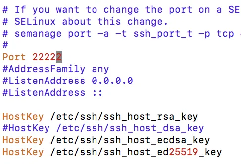 直接修改ssh配置文件/etc/ssh/sshd_config,找到#Port 22这一项并修改,这里改为2222